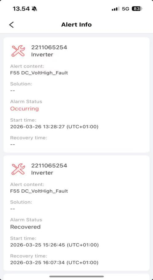 Платформа сообщает F55 DC - Вольт Высокий - Неисправность, указывающая на перегрузку шины постоянного тока напряжение. Неисправности возникают во время дневного максимума. - периоды облучения и автоматически очищаются, когда освещенность падает. Повторяющийся шаблон соответствует типичному времени перенапряжения постоянного тока.