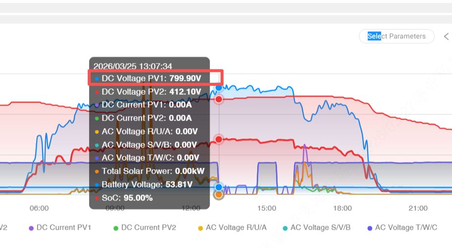 Этот случай типичен: количество серий цепочек PV1 слишком велико, поэтому напряжение холостого хода достигает 799,90 В, что значительно превышает значение инвертора. ' допустимый вход. При сильном облучении неизбежно срабатывает защита от перенапряжения. В некоторых случаях также наблюдается дисбаланс между PV1 и PV2 в типе модуля или количестве цепочек, что приводит к превышению безопасного напряжения одной цепочки.